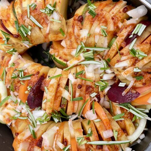 - Kartoffeln gründlich waschen und in feine Scheiben schneiden, ohne die Kartoffel vollständig durchzuschneiden.